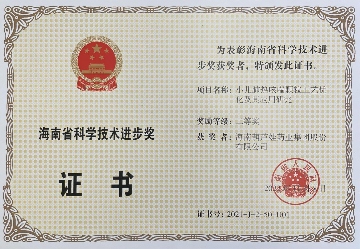 为此,小儿肺热咳喘颗粒的制备方法获得了第二十一届中国专利优秀奖(2019年),专利申请号:ZL201010134951,此次作为专利技术的应用,获得了2021年度海南省科学技术进步奖二等奖。在此之前,3044am永利牌小儿肺热咳喘颗粒还多次被授予“临床价值中成药品牌”、“中国连锁药店最具合作价值单品”,荣登“中国医药品牌榜”。